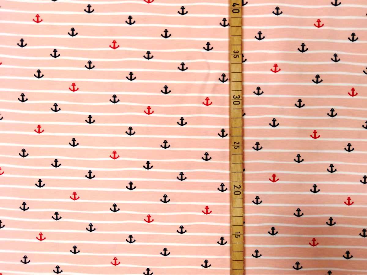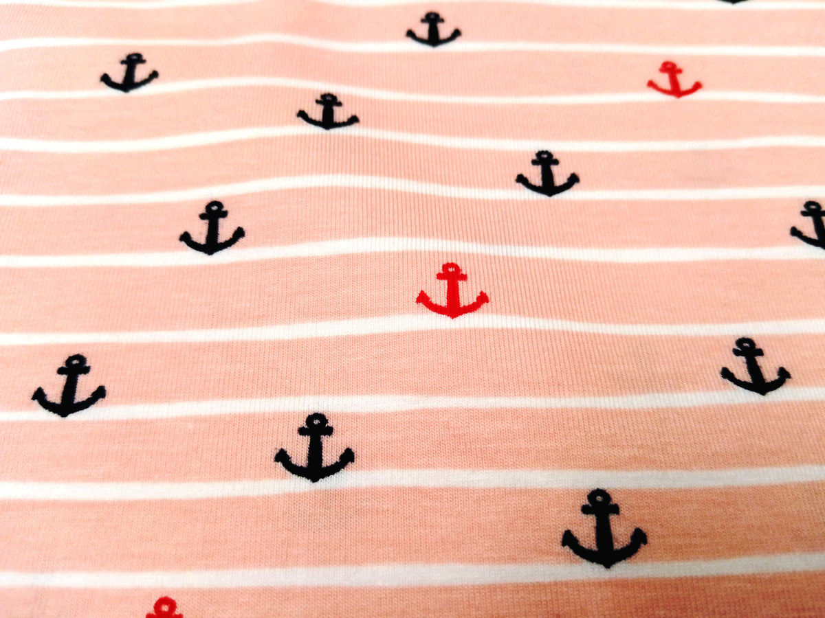 Maritimer Bio Baumwolljersey gestreift in hellem lachsrosa mit kleinen Ankern