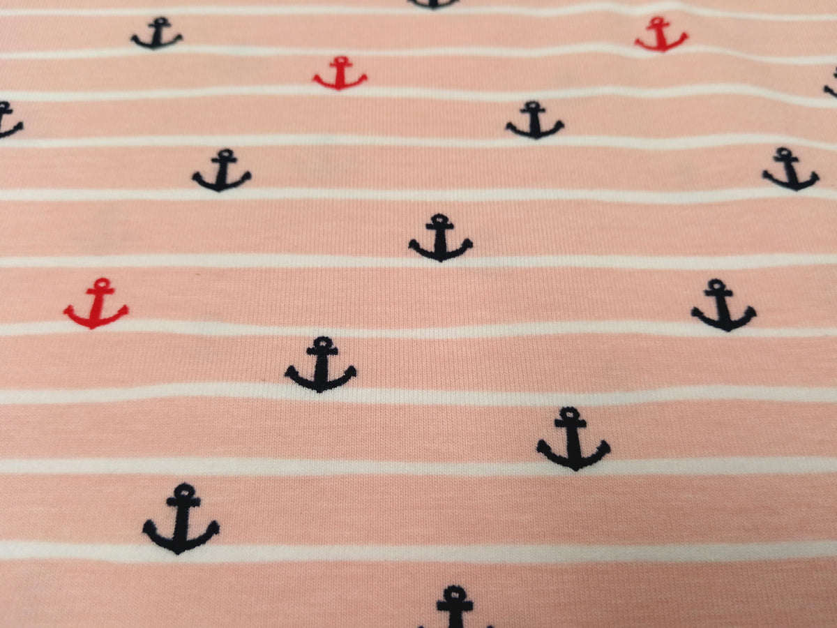 Niedlicher Bio Baumwolljersey für Kinder in lachsrosa mit weißen Streifen und bunten Ankern. Für Shirts, Kleider, Overalls, Schlafanzüge. Für Babys, Kleinkinder und Kinder.